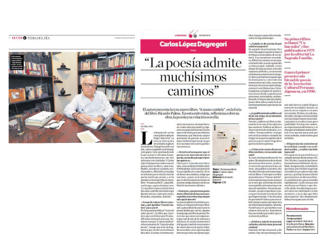 Entrevista al poeta Carlos López Degregori en el suplemento Luces del diario El Comercio, a propósito del lanzamiento de su nuevo libro, «A mano umbría», conjunto de textos que discurren entre la poesía, la reflexión y la hibridez.