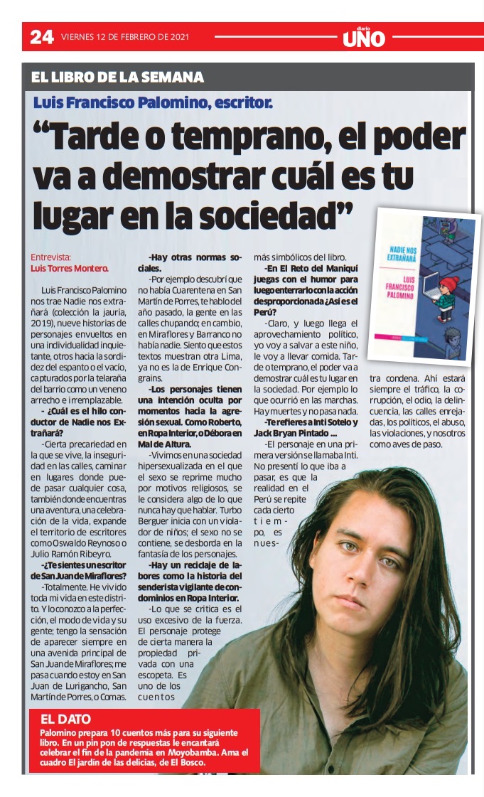 Entrevista a Luis Francisco Palomino en la contratapa del Diario Uno, a propósito de su libro de cuentos «Nadie nos extrañará».